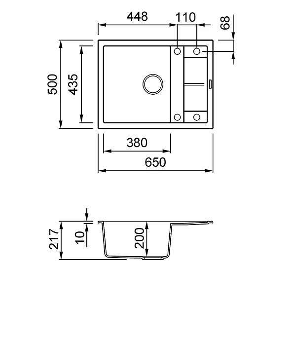 Integrovaná oblast pro příslušenství v odkapávači, vybavená předvrtanými otvory, které vám umožňují instalovat doplňky: excentrické ovládání odpadu, dřezovou baterii s vytahovací sprchou a dávkovač saponátu.